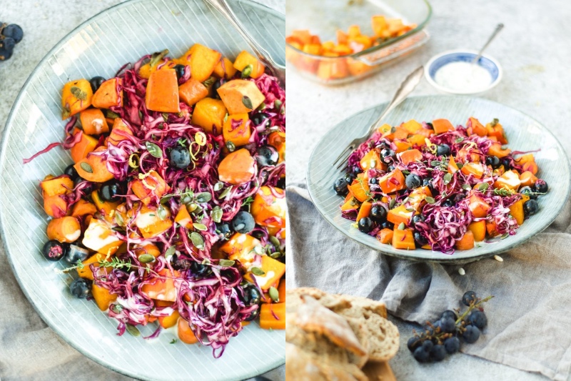 Summer is over, which means pumpkin season is upon us. Take advantage of this and try to make this yummy autumn salad that incorporates the best of autumn produce. Baked pumpkin, sweet potato, carrots, purple cabbage – they all go so well together, but this almond thyme salad dressing is what really puts this salad on a whole new level.